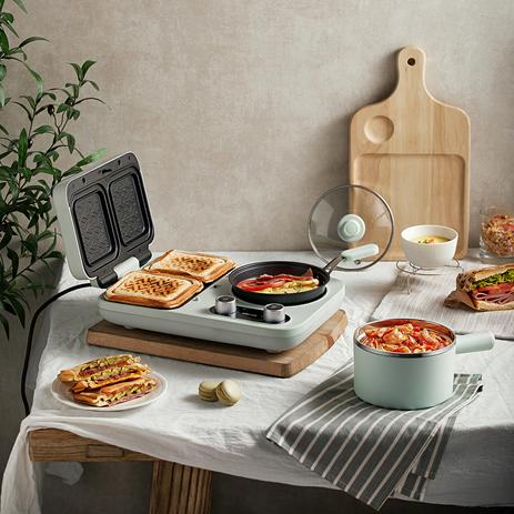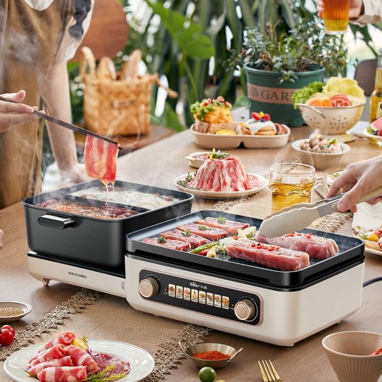 除了基础的涮煮功能,小熊还有很多“小心思”。有的锅做成了方形,有人说这样放在桌上更稳当,四个边都能用,夹菜也方便-4。还有那种鸳鸯锅的设计,一边辣到过瘾,一边菌菇鲜美,完美解决“众口难调”的家庭矛盾-7。更绝的是还有“叠叠锅”或者多功能料理锅,一口锅配上不同烤盘,就能解锁煎烤烙焖各种技能,对于厨房空间有限的租房党或者喜欢尝试新花样的年轻人来说,性价比就很高了-1。