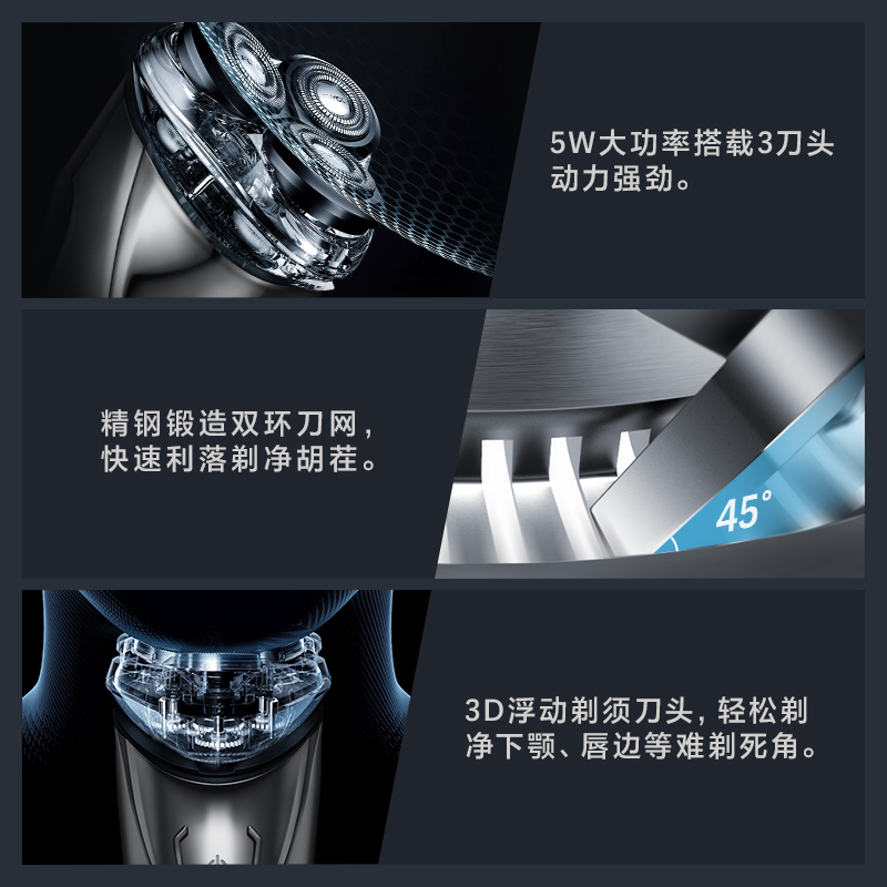 先说说最实在的,就是上脸的感觉。我之前用的那个老伙计,动力不足,在脸上吭哧吭哧的,像辆老拖拉机,下巴和脖子那块儿硬一点的胡茬根本剃不彻底,摸上去总是扎手的,尤其赶着见客户前,那叫一个烦躁。飞科FS339这点就做得挺灵,它那三个刀头不是死板的,能自个儿上下浮动-3。你拿着它贴着脸走,它能顺着你下巴、喉咙骨的曲线拐弯,紧紧贴住皮肤-1。官方管这个叫“双环贴面”还是“浮动贴面”系统,咱不管那名头,实际感受就是,以前得反复来回蹭的地方,现在基本一两遍就过,剃完用手一摸,是那种光滑的干净,不是假滑,这点让我挺意外-3。所以头一回用的时候,我心里就嘀咕:这飞科FS339怎么样?至少在“面子工程”的干净利落程度上,它算是交了一份高分答卷,解决了剃不净、留胡茬的核心痛点。